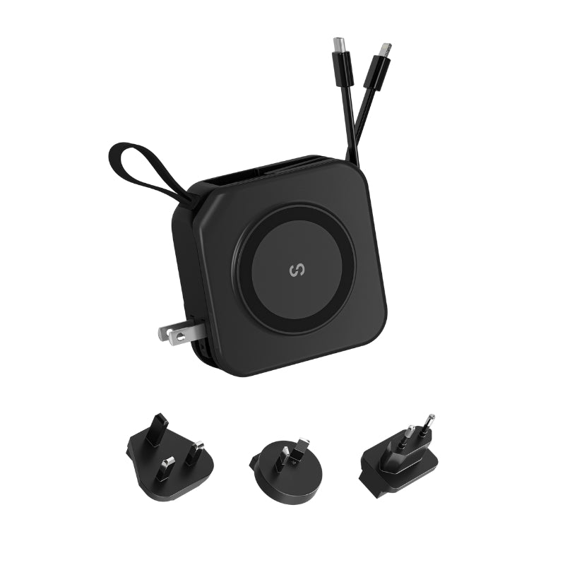 PowerPack Universal is the ultimate travel charger with included interchangeable adaptors, built-in stand and Free bag/pouch.